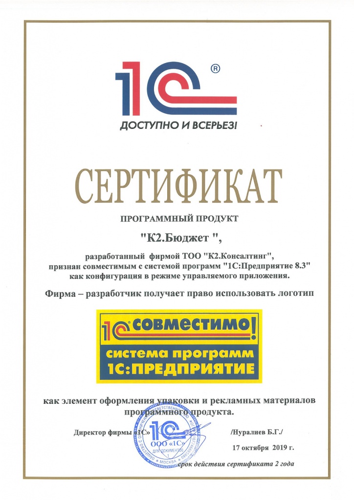 Продукт «К2.Бюджет» получил очередной сертификат «Совместимо! Система программ 1С:Предприятие»